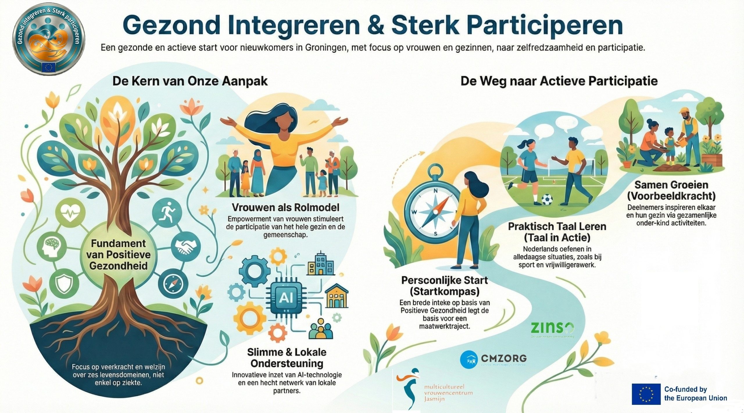 Gezond integreren – Sterk participeren verwelkomt inburgeringsplichtigen, met extra aandacht voor vrouwen en gezinnen, voor een gezonde en actieve start in Groningen. Samen bouwen we aan jouw welzijn met persoonlijke begeleiding, praktijkgerichte taallessen, sportieve activiteiten, vrijwilligerswerk en leuke ouder-kindworkshops – zodat je sterker meedoet in de samenleving. Als deelnemer word je een rolmodel voor je gezin en anderen, met hulp van onze AI-tool voor snellere ondersteuning. Penvoerder is Stichting Multicultureel Vrouwencentrum Jasmijn, samen met partners zoals Cultureel Maatschappelijk Zorgbureau en Zinso Zorggroep – mede mogelijk gemaakt door AMIF/EU-subsidie (2025-2028). Doe mee en groei!